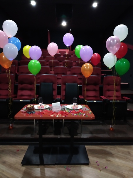 Вот такой сюрприз приготовил один замечательный человек для своей девушки!!!!! На день ее рождения 17 августа он заказал весь зал в кинотеатре "Пальма", организовал столик на двоих, а мы создали вот такую сюрпризно-романтическую обстановку)) дело в том, что у этих чудесных людей ещё есть маленький ребенок, так что сюрприз для мамы, думаем, плавно превратился в сюрпризно-романтическую воздушное облако из светящихся и гелиевых шариков для ребенка))) все счастливы))))